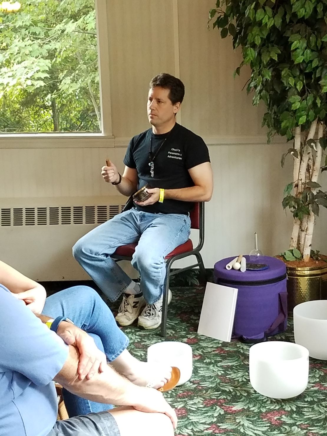 Consider that running your finger around the edge of a crystal glass filled with water makes it ring, and the water itself shift. Because we are about 65-70% water, we react to the sound of crystal bowls similarly as their vibration moves through us. The tones or specific notes of each bowl activate different chakras, organs and emotions which may assist you to re-balance, relax and restore health. Chuck includes color and additional crystal chimes to create an amazing experience.